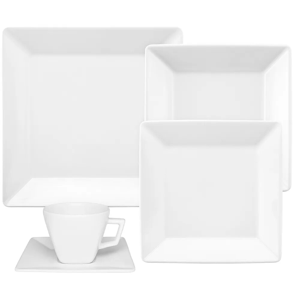 Conteúdo da Embalagem : 4 pratos rasos com medidas de 26,5 x 26,5 cm / 4 pratos fundos com medidas de 21 x 21 cm / 4 pratos para sobremesa com medidas de 20 x 20 cm / 4 xícaras para chá (200 ml de capacidade) com pires (medidas de 14 x 14 cm)