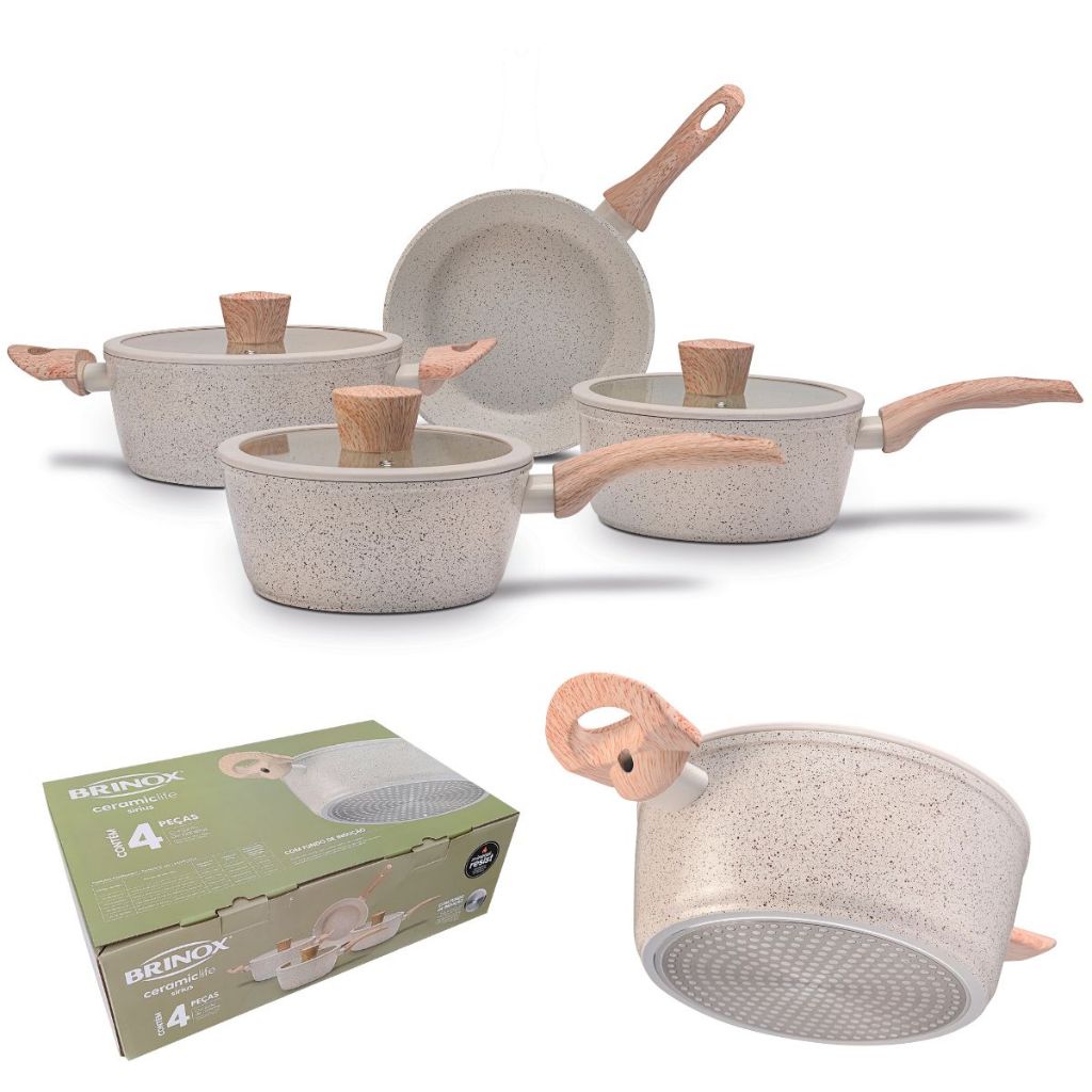 Conteúdo: 1 Caçarola 22cm 2.7L, 1 Frigideira 22cm 1.2L, 1 Panela 18cm 1.5L e 1 Panela 20cm 2.1L